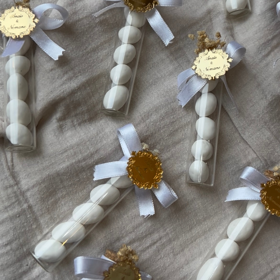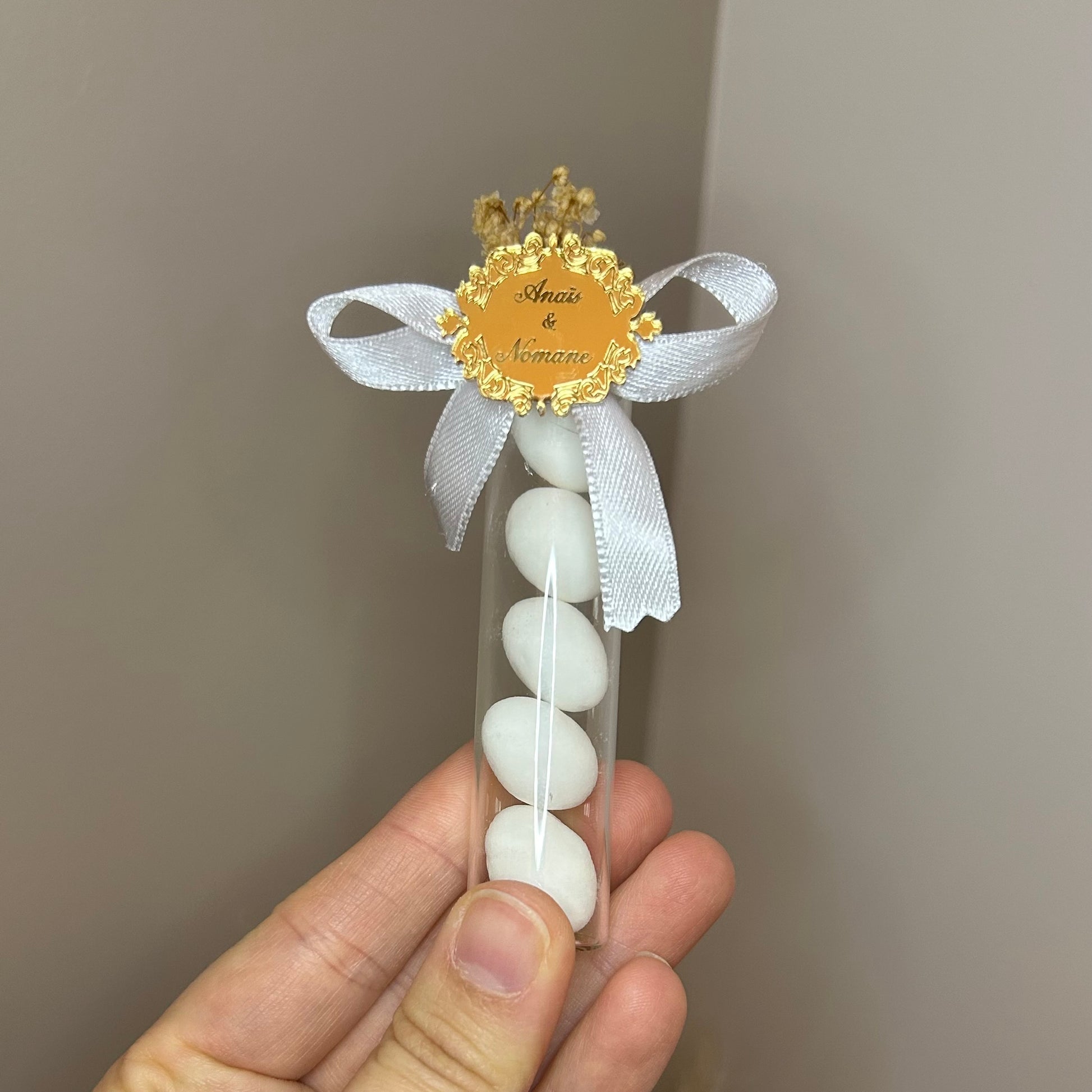 Fioles en verre pour dragées, pour des cadeaux invités pour vos événements, mariages, baptêmes, fiançailles, anniversaires etc.. Les dragées sont blanches et goûts amandes, pour autre saveur/couleur merci de nous contacter avant la commande.