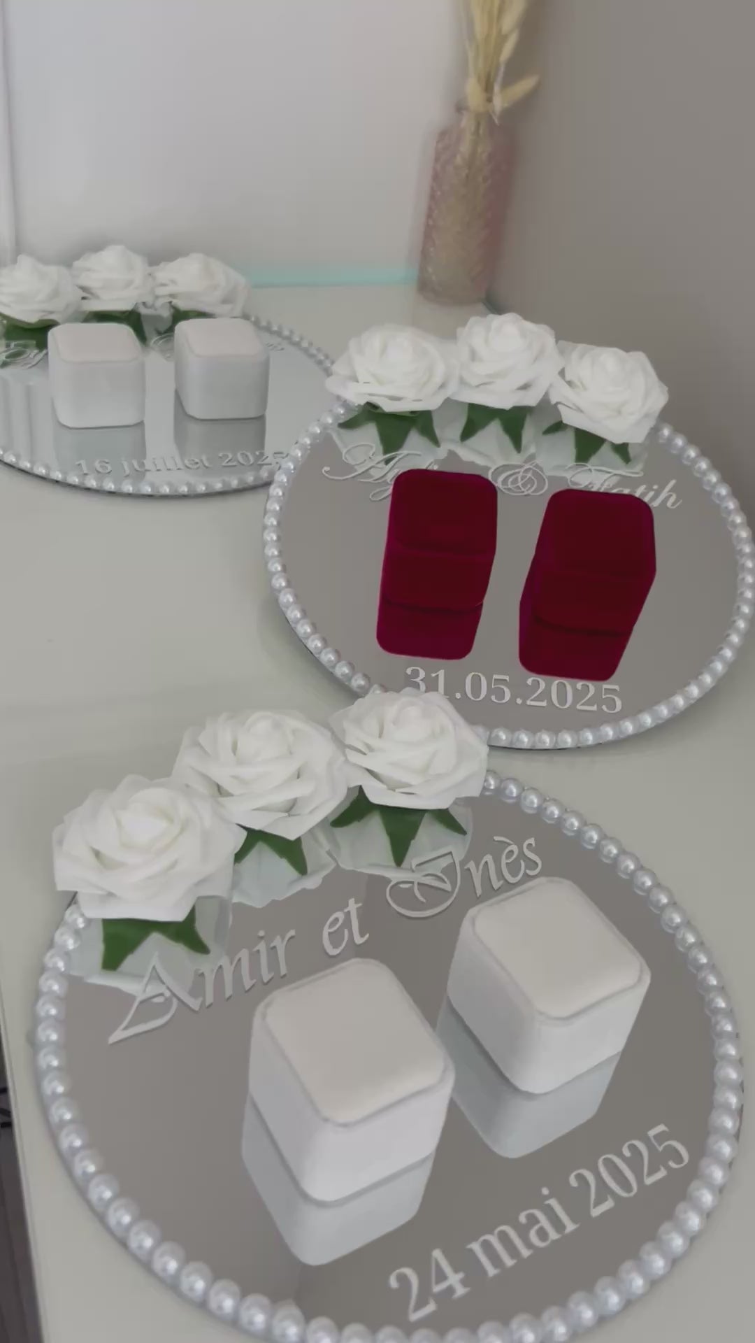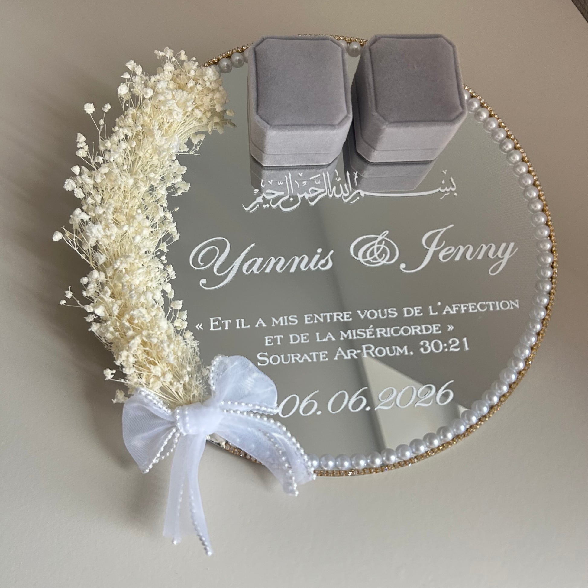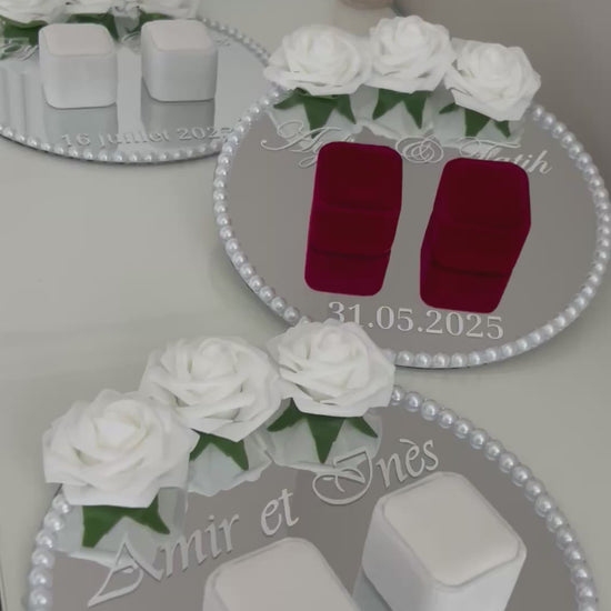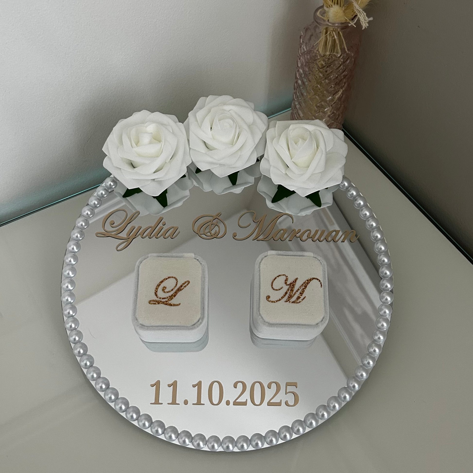 Ajoutez une touche de modernité et de raffinement à votre cérémonie grâce à notre plateau d’alliances miroir, l’accessoire parfait pour sublimer l’échange des anneaux et créer des souvenirs inoubliables.