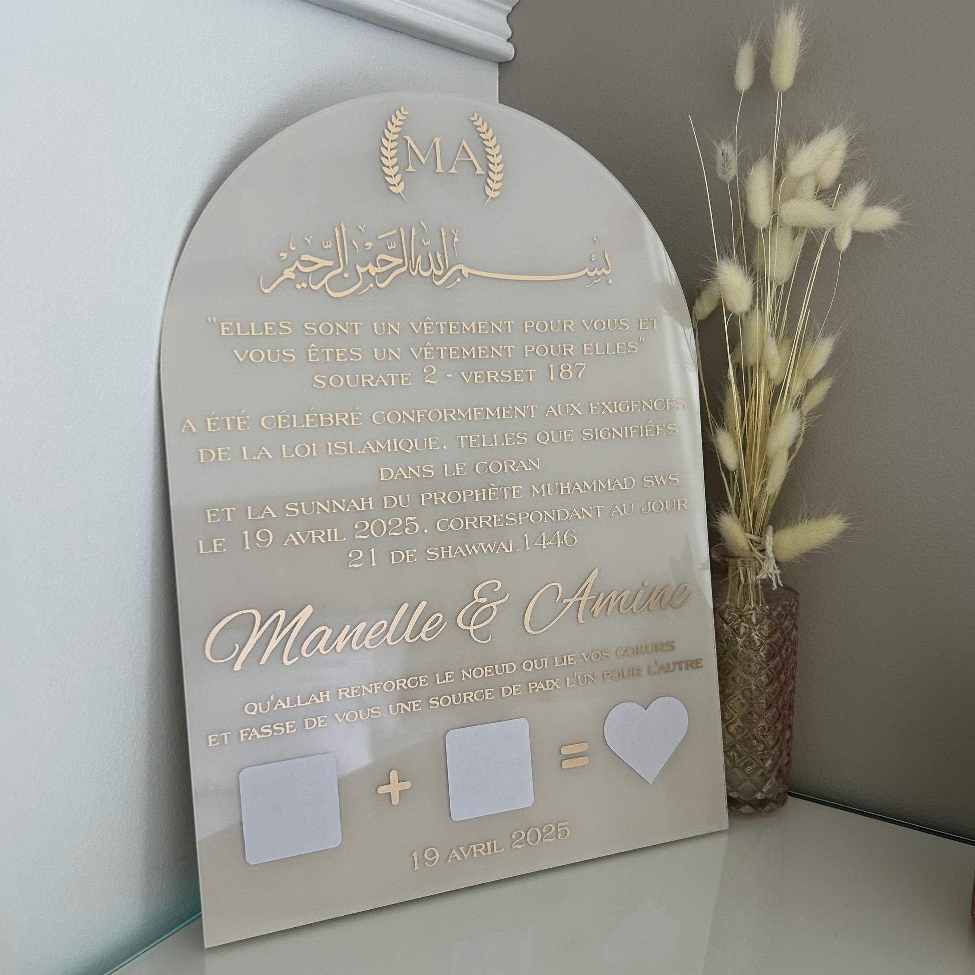 Découvrez cette magnifique empreinte en plexiglas, (arche sans socle 25x35 cm ou forme arabique 19,5x25 cm avec socle) idéale pour garder un beau souvenir du jour de votre mariage ❤